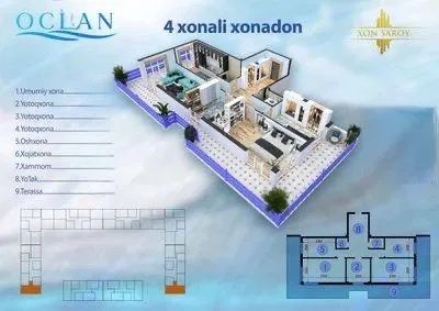 Срочно! 4-комнатная 149 м² в ЖК Ocean — Юнусабад Продаётся квартира в ЖК «Ocean» (Xonsaroy) Уч-Кахрамон, Юнусабадский район Ориентир Уч-Кахрамон бозори, напротив ресторана «Туркистон» Параметры квартиры • Комнат: 4 • Этаж: 3 • Этажность дома: 16 • Общая площадь: 149 м² — жилая: 109 м² — балкон: 40 м² Состояние • Черновая отделка (кум сувок) • Квартира разделена на 5 помещений • Электромонтажные работы полностью завершены Документы • Кадастр имеется Цена 100 000 $ СРОЧНО!!! +998900311102 Достон +998994444695 Абдурахмон