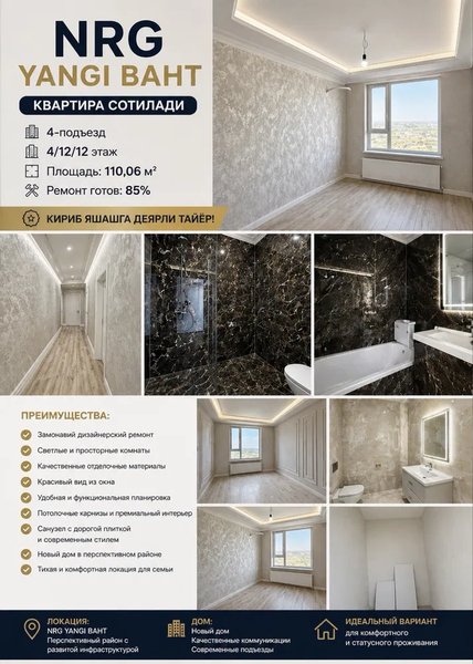 Новостройка nrg yangi baxt Писать в телеграм NRG YANGI BAHT — КВАРТИРА СОТИЛАДИ 4-подъезд 4/12/12 этаж Площадь: 110,06 м² Ремонт готов: 85% Тёплый пол установлен Квартира делалась для себя — не для продажи Качественный и дорогой ремонт 3 санузла 4 комнаты Не торец Гардеробная Лоджия Газ С кадастром Закрытый двор Face ID система Замонавий дизайнерский интерьер Светлые и просторные комнаты Удобная и функциональная планировка Потолочные карнизы и премиальный стиль Новый дом в перспективном районе Тихая и комфортная локация для семьи Кириб яшашга деярли тайёр Серьёзным покупателям — отличный вариант для комфортной и статусной жизни.