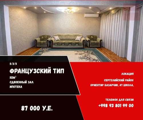 Продаю квартиру массив-5 Продаётся СРОЧНО квартира, Сергелийский район Куйлюк массив 5. 5/4/5 с ремонтом Французская планировка Квадратура: 112 м2 Комнат: 5 Этаж: 4 Этажность: 5 Дополнительно: 103000$ Торг уместен для реальных клиентов Рядом есть: 500м до метро. Подробно по те; 909731889
