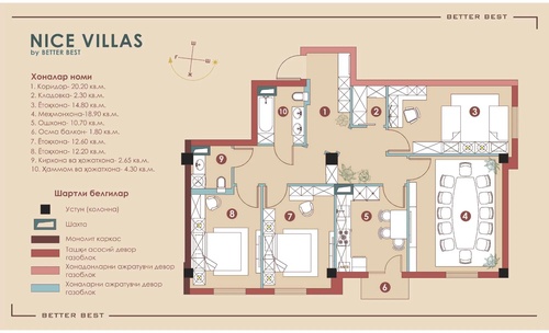 Новостройка! Ўзимники (cвоя) 4/2/10 100kв.м, Метро Олмос (4-бекат) ТЖМ "Nice Villas". Қурувчи: Better Best. Барча коммуникатсиялар(газ, сув, электр) уланган, аҳоли тўлиқ яшамоқда. Уй 2024- йилда фойдаланишга топширилган. Ҳолати: хоналарга ажратилаган ва стяжка қилинган, тамири йўқ. Уй монолитдан, деворлар автоклав газоблокдан. 24/7 қуриқлаш хизматидаги ёпиқ ҳудуд. Подезд кириш эшиклари кодли. Шинам ички ҳовли, болалар майдончаси ва беседкалар мавжуд. Ер ости(сотиб оласиз) ва усти(текин) автотураргох мавжуд. Атрофда: "Олмос" метро бекати, мактаб, болалар боғчаси, озиқ- овқат дўконлари ва гўзаллик салонлари мавжуд. Кадастр ҳужжатлари тўлиқ, мулк ҳуқуқи расмий, сотувга тайёр. Жойлашув: "Олмос" метро бекати ва Роҳат круги оралиғида, тураржой мажмуасидан Оҳангарон катта йўлигачан 400м. Манзил: Яшнобод тумани, Олмос маҳалласи, Яккатол 3 тор кўча. ЖК "Nice Villas". Застройщик: Better Best. Все коммуникации проведены (Газ, вода, электричество), весь ЖК заселен. ЖК сдан в эксплуатацию в 2024г. Состояние: комнаты разделены перегородками, выполнена стяжка, без ремонта. Монолитный дом со стенами из автоклавного газоблока. Закрытая и на 24/7 охраняемая территория с камерами наруж.наблюдения. Двери подъездов кодовые. Уютный дворик с детской площадкой и беседками. Надземные и подземные(по оплате) парковочные места. В окрестности: станция метро "Олмос", школа, детский сад, продуктовые магазины и салон красоты. Кадастр имеется, квартира готов на продажу. Локация: Между метро "Олмос" и кругом Рахат, с ЖК до Ахангаранской трассы 400м. Адрес: Яшнабадский район, махалля Алмас, Яккатал 3- переулок.
