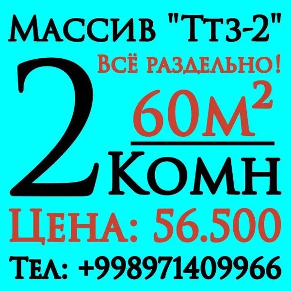 2-Хона. 60м². ИПОТЕКА. ПРОДАЖА. Массив Ттз-2. ПРОДАЁТСЯ 2х Комнатная квартира. 2-Комн/6/9 Всё раздельно. Цена: 56.500 ИПОТЕКА РАССМАТРИВАЕТСЯ. ИПОТЕКА БОР. Тел: +998971409966 Ттз. Феруза. Ялангач. Буз. Академгородок.